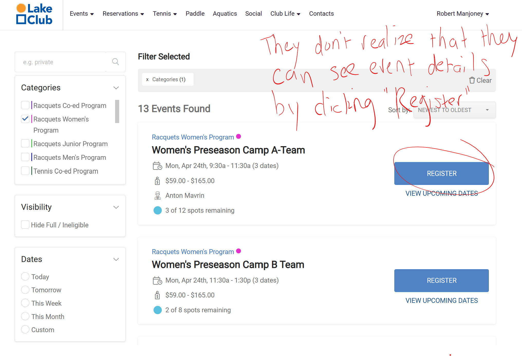 This is a source of confusion for our members, since there is no obvious way for them to view an event's description/details - all they see for live events is an option to "Register", and they are reluctant to click on it, especially since they want to know more about the event itself before they commit to registering, and it's not obvious that clicking on that button will take them to the main event page with full details/description without actually registering.
